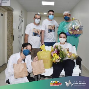 Tainara juntamente com Roci (Pai), Marcelo (esposo), Wagner (enfermeiro) e Carolina (Psicóloga) no momento de sua alta “Agora finalmente em casa, gostaria de deixar o meu agradecimento a todos os profissionais que cuidaram de mim nesse período em que estive na UTI Covid, assim, como cuidaram do meu filho! Como Cristã, não poderia deixar de falar que somos um milagre. Eu e minha família somos gratos por cada um que esteve conosco!” Finaliza Tainara.