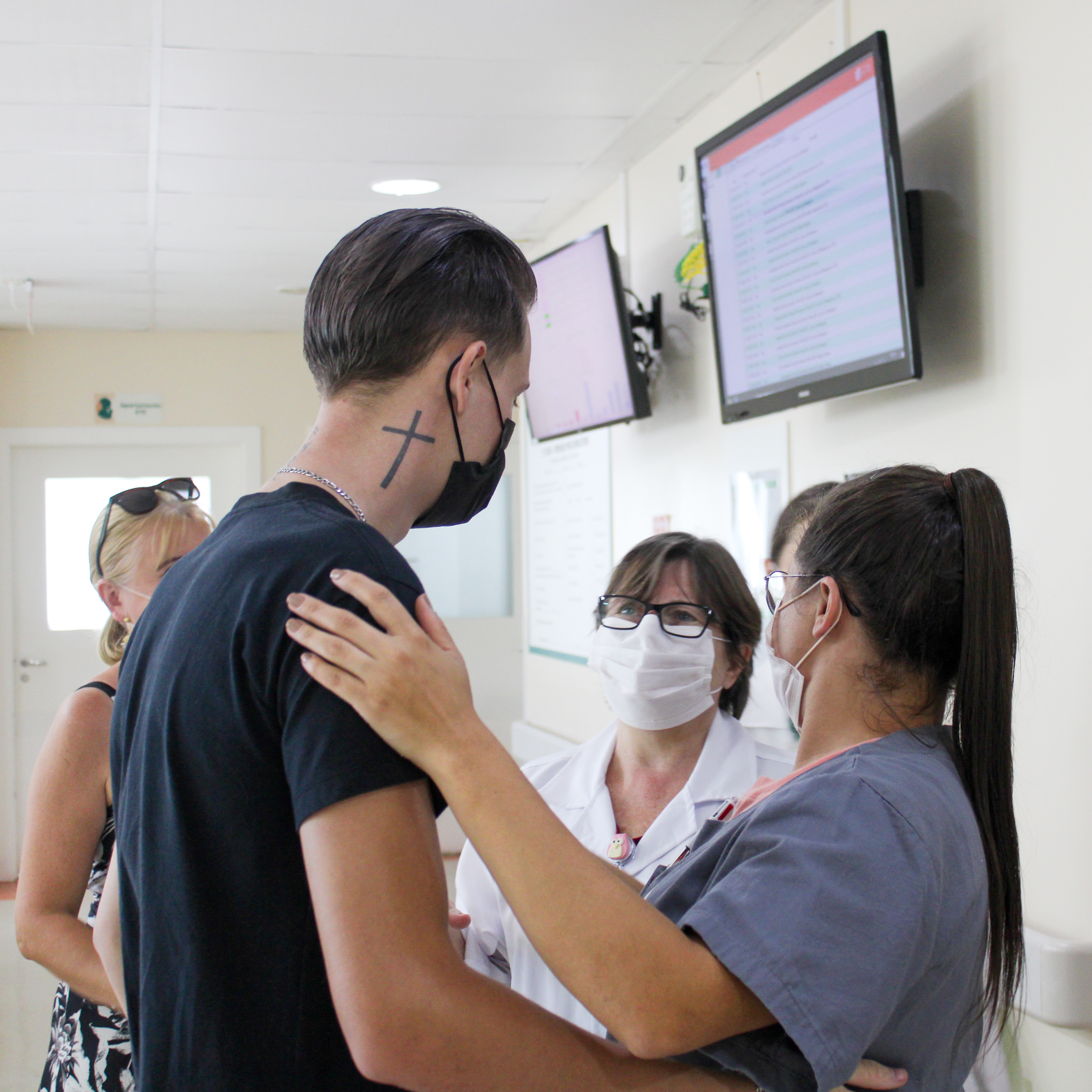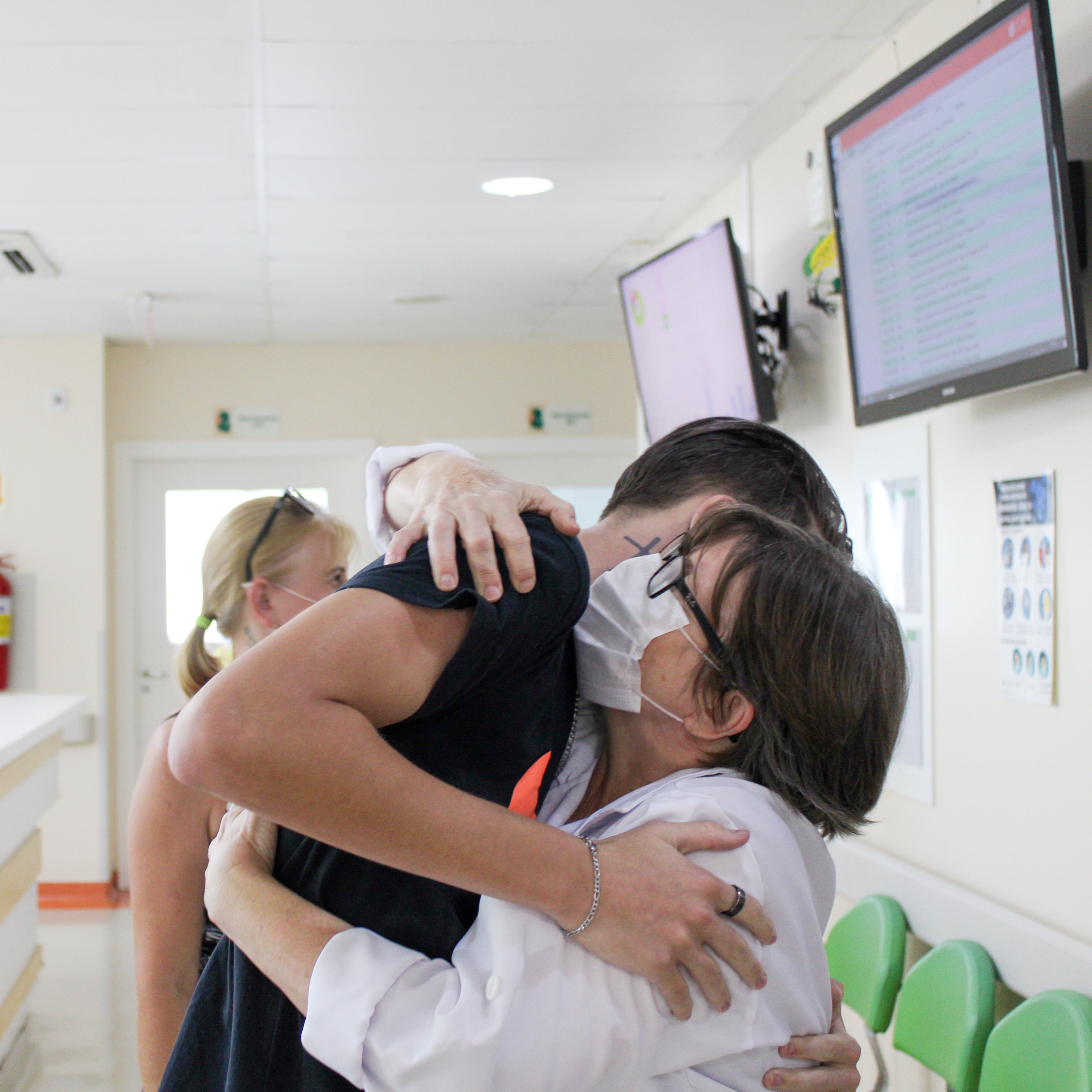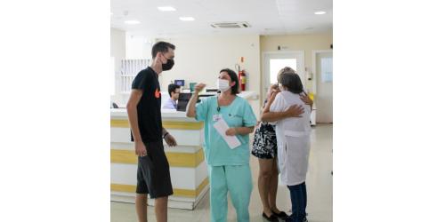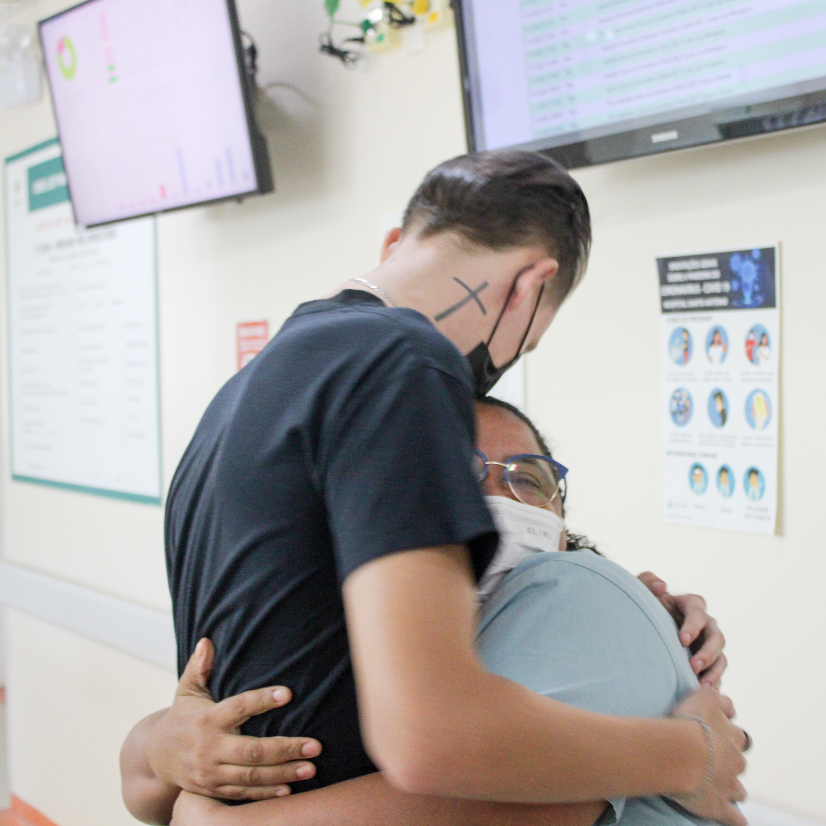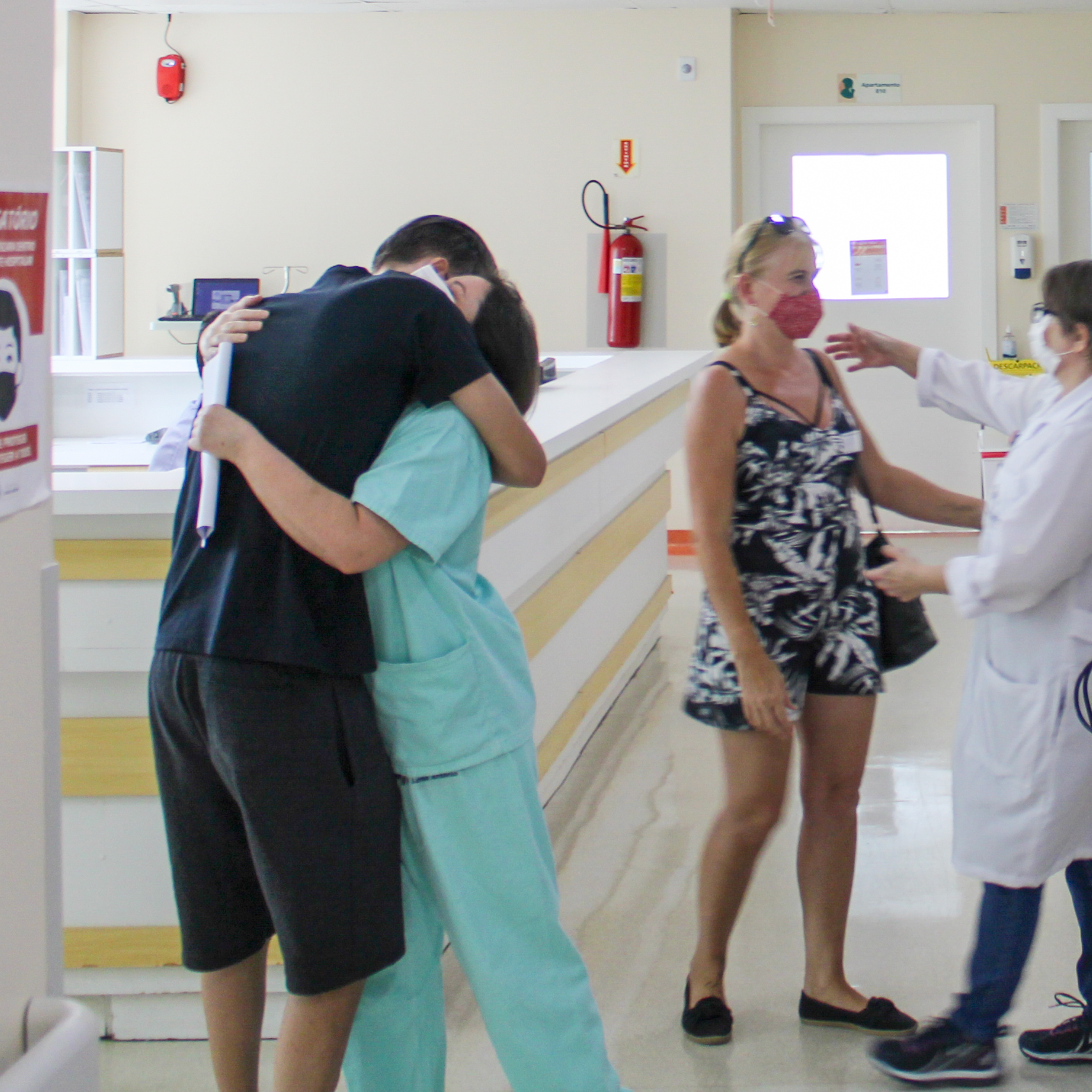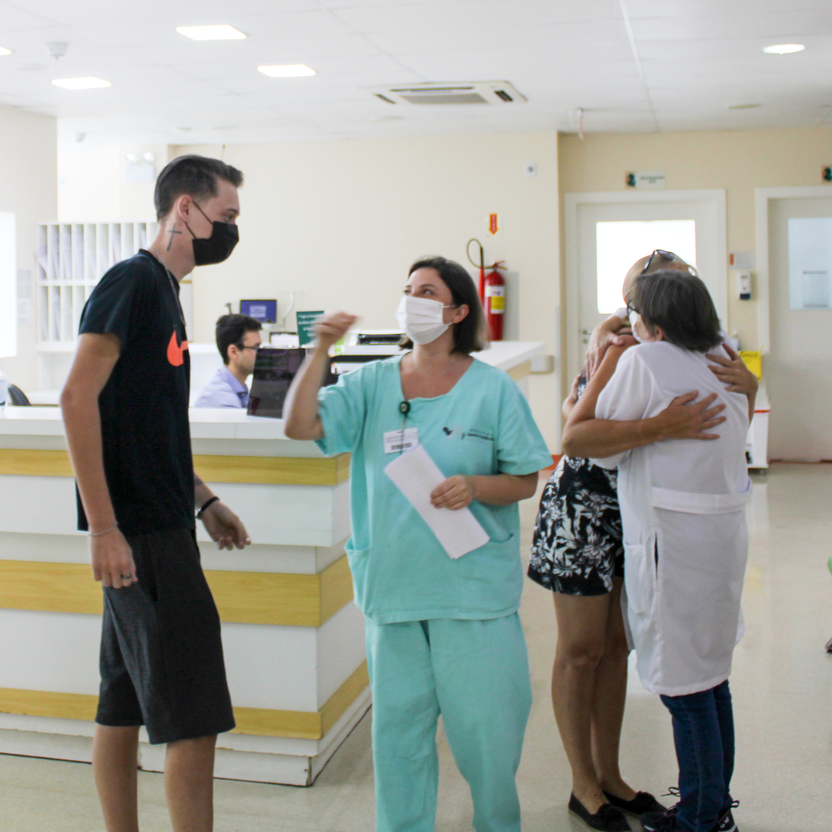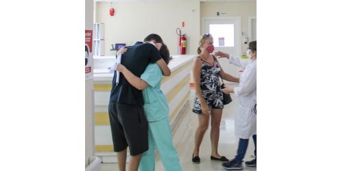 Depois de ficar mais de 90 dias internado, em duas internações, Edson Geiseler Filho voltou hoje ao Hospital Santo Antônio e encontrou a equipe multiprofissional que o atendeu durante o período. Em uma visita rápida, Edson conversou com os profissionais que o atenderam e reencontrou parte da equipe que cuidava dele enquanto ainda estava desacordado. Edson passou por dois setores dentro do hospital, a UTI Geral e enfermaria, e recebeu atendimento de diversos profissionais que o acompanharam desde o primeiro momento. Na primeira alta, após 60 dias internado, Edson saiu do hospital fardado e surpreendido pela banda do 23º BI, ao lado da mãe que o acompanhou durante todos os dias da internação. A presença dela ao seu lado foi muito importante para o seu processo de recuperação. O momento do reencontro também foi marcante para a equipe que tratou Edson durante o período que passou no HSA. Charlene Thomé, psicóloga do hospital, esteve presente em todos os momentos. Foi ela que fez o primeiro atendimento com a mãe do soldado, que veio ao hospital aflita em busca de informações do filho acidentado. Como toda a equipe que esteve presente, Charlene sentiu muita emoção ao ver Edson recuperado, “Vê-lo recuperado e percebê-lo feliz, vivendo ao lado de pessoas importantes, é muito bom. Ouvi-lo falar e ver o brilho no olhar ao contar sobre suas vivências e realizações atuais é de grande satisfação. Tão bom poder revê-lo, buscando seus sonhos da forma como escolhe diariamente ser e estar feliz”, declara. A Família HSA agradece a visita de Edson, são gestos como este que reforçam cada vez mais o nosso compromisso com a vida. Texto e foto: Júlia Laurindo