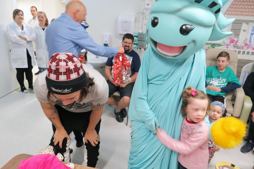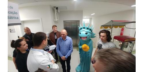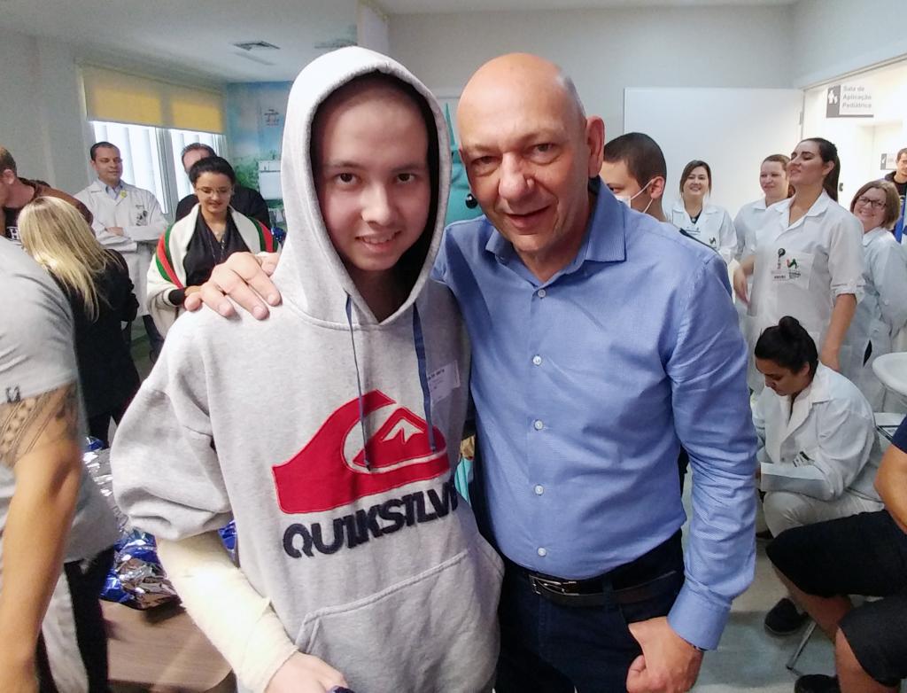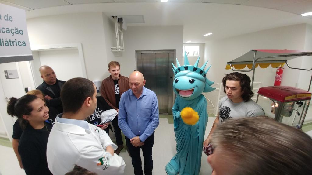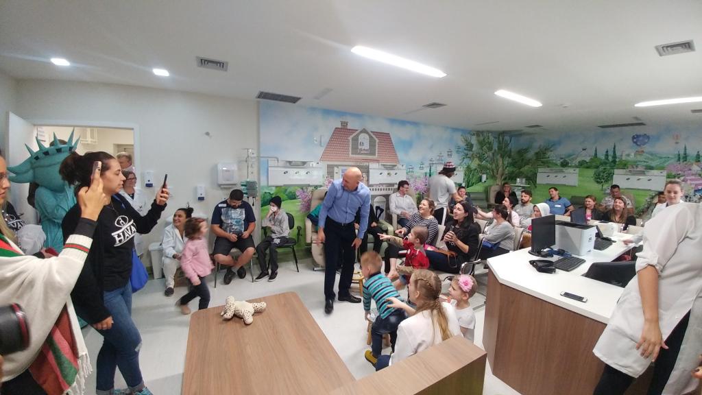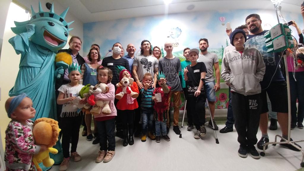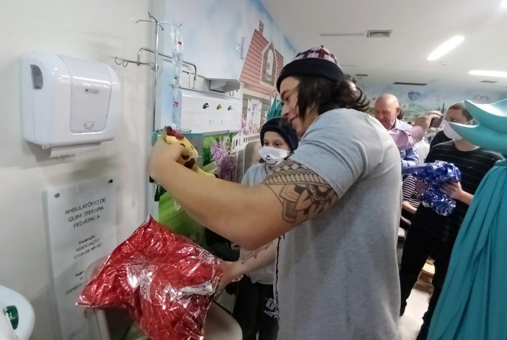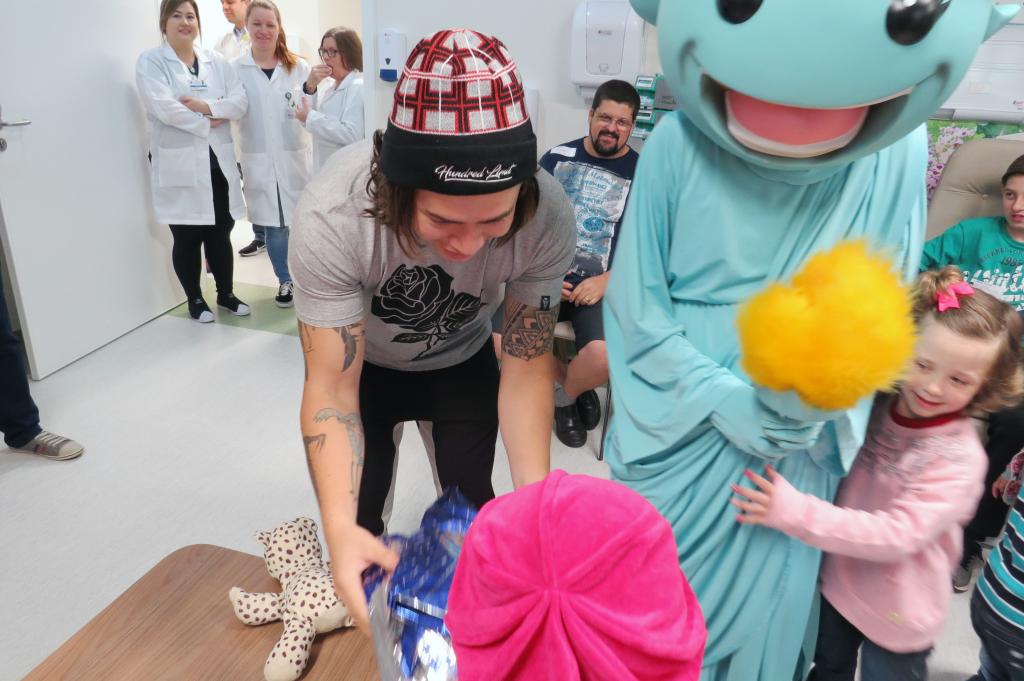 Ontem (16/09) foi um dia de muita alegria para os nossos pequenos pacientes da oncologia pediátrica. As crianças em tratamento médico esqueceram o ambiente hospitalar e se divertiram em um domingo diferente no Hospital Santo Antônio, com a visita especial do humorista Whindersson Nunes e do empresário Luciano Hang (Havan). A nova sala de quimioterapia infantil foi preparada para receber as crianças e seus familiares, que também participaram do evento e tiraram fotos com os convidados e com a “Liberdade” (estátua da Havan). Em um mundo onde, cada vez mais, as pessoas tem pouco tempo, é possível imaginar alguém doando o seu? Só no ano de 2017, a equipe de voluntários do Hospital Santo Antônio doou 6.857 horas em benefício de outras pessoas. Whindersson Nunes e Luciano Hang, ambos foram voluntários na visita, conheceram mais sobre o setor de oncologia do Hospital Santo Antônio, que é referência desde 2005 para 14 municípios do Vale do Itajaí. Entregaram presentes para as crianças, além de fazer questão de tirar fotos e atender, um por um, com todo carinho e atenção. Na ocasião, foi lançada, oficialmente, a data do primeiro Jantar Dourado do Hospital Santo Antônio, que será realizado no dia 27 de novembro, com o apadrinhamento de ambos os convidados especiais. O objetivo é angariar fundos para a construção de uma nova ala exclusiva de Oncologia Pediátrica, que terá, no mínimo, 12 leitos completamente equipados para melhor atender os pacientes infantis. Para celebrar o momento, a organização do Jantar Dourado, junto com a ASA - Associação Amigos do Hospital Santo Antônio, prepara uma noite especial aos seus convidados, com direito a show ao vivo, com a participação de pacientes e voluntários, exposição fotográfica, palestras, além de um buffet delicioso com saladas, prato principal e sobremesa. Mais informações em breve pelo site www.jantardourado.com.br Jantar Dourado do Hospital Santo Antônio Data: 27 de Novembro de 2018 Horário: 19:30h Valor: R$100 por pessoa Local: Tabajara Tênis Clube [gallery columns="5" link="file" ids="8856,8805,8806,8859,8807,8808,8809,8810,8811,8855,8812,8813,8814,8815,8816,8817,8818,8819,8820,8821,8822,8823,8824,8825,8826,8827,8828,8829,8830,8831,8832,8833,8834,8835,8836,8837,8838,8839,8840,8841,8842,8843,8844,8845,8846,8847,8848,8849,8850,8851,8852,8857,8858"]